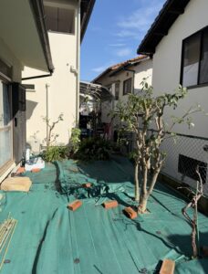 作業では周囲に注意を払いながら、蔦が絡んだ木を丁寧に伐採。草刈りも徹底して行い、見違えるほどすっきりとしたお庭に生まれ変わりました。